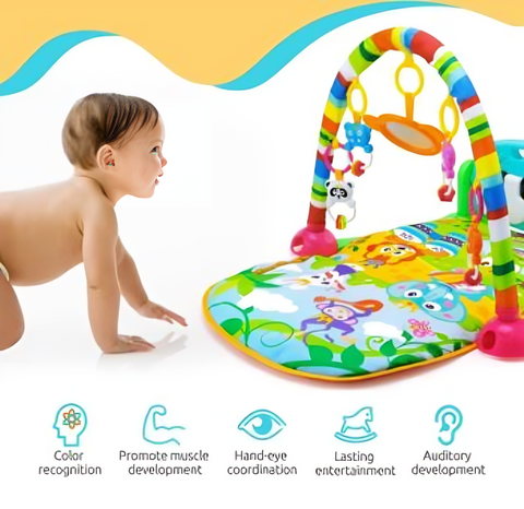 Discover the interactive piano play mat from Hibaby! This versatile play mat sacrifices the perfect solution to develop your child's senses while lying comfortably. With a play arch full of fun toys, rattles and a mirror, curiosity is stimulated. The Piano Keys Respond to Pedal Movements, Allowing Your Child to Playful Make Music and Experience Cheerful Light Effects.
