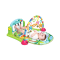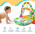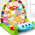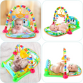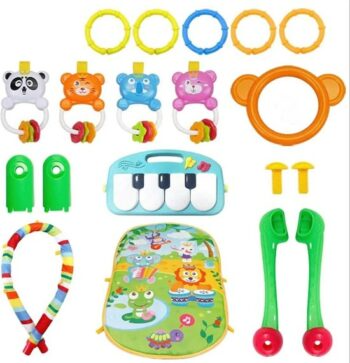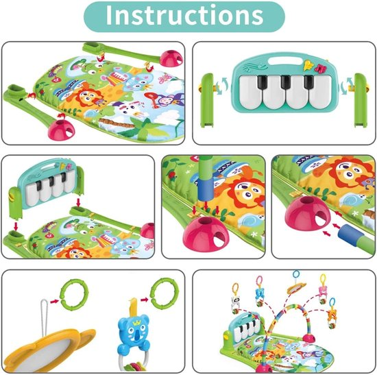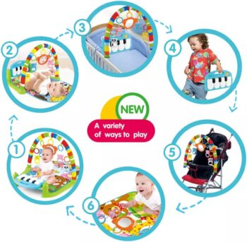 Dit is een kleurrijk en interactief baby speelkleed met een zachte mat, een speelboog met hangende speeltjes en een muziekpaneel met toetsen.